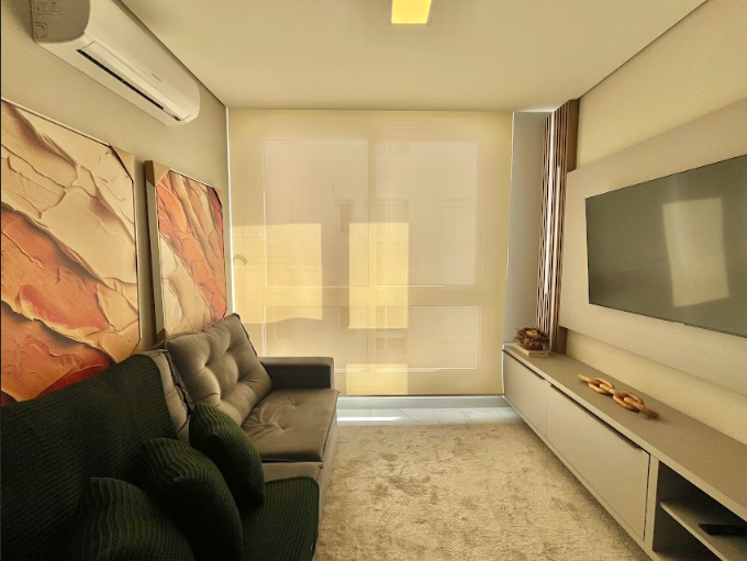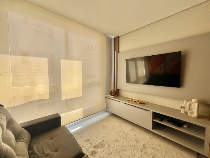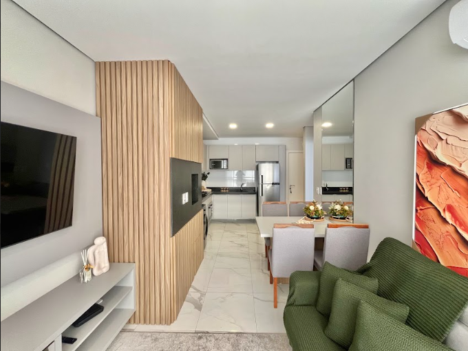 Apartamento com 1 dormitório, banheiro social, finamente mobiliado e decorado, com 57m² privativos e box de estacionamento.