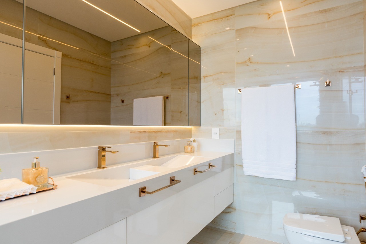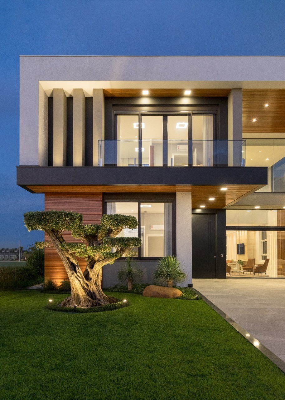 A sala de cinema, automação completa para iluminação, cortinas e ar condicionado, além de uma cozinha gourmet com churrasqueira rotativa, adega e cervejeira, tornam o espaço perfeito para entretenimento. Os acabamentos incluem revestimentos Portinari, bancadas em concreto esculpidas à mão, e detalhes de luxo como cristais de Murano e móveis com pintura automotiva.
