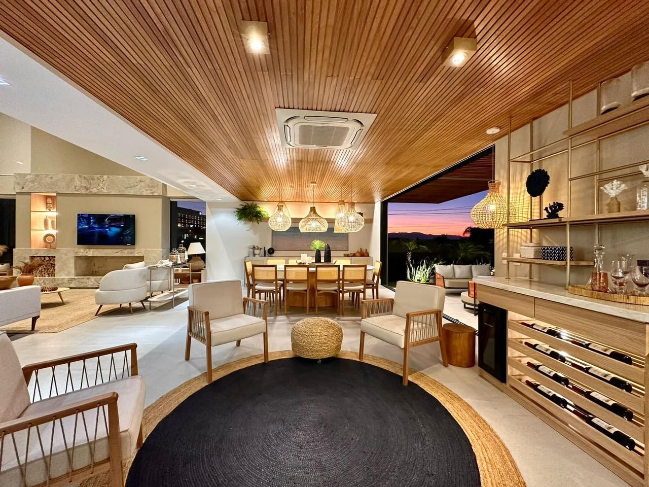 São 5 suítes (incluindo uma master e uma térrea), além de uma suíte de serviço, distribuídas em ambientes amplos e integrados. O living com pé direito duplo, totalmente mobiliado e decorado, é um convite ao bem-estar. Conta ainda com lareira, espaço gourmet, piscina com prainha e deck, paisagismo com irrigação automatizada, automação completa, climatização em todos os cômodos e persianas motorizadas.