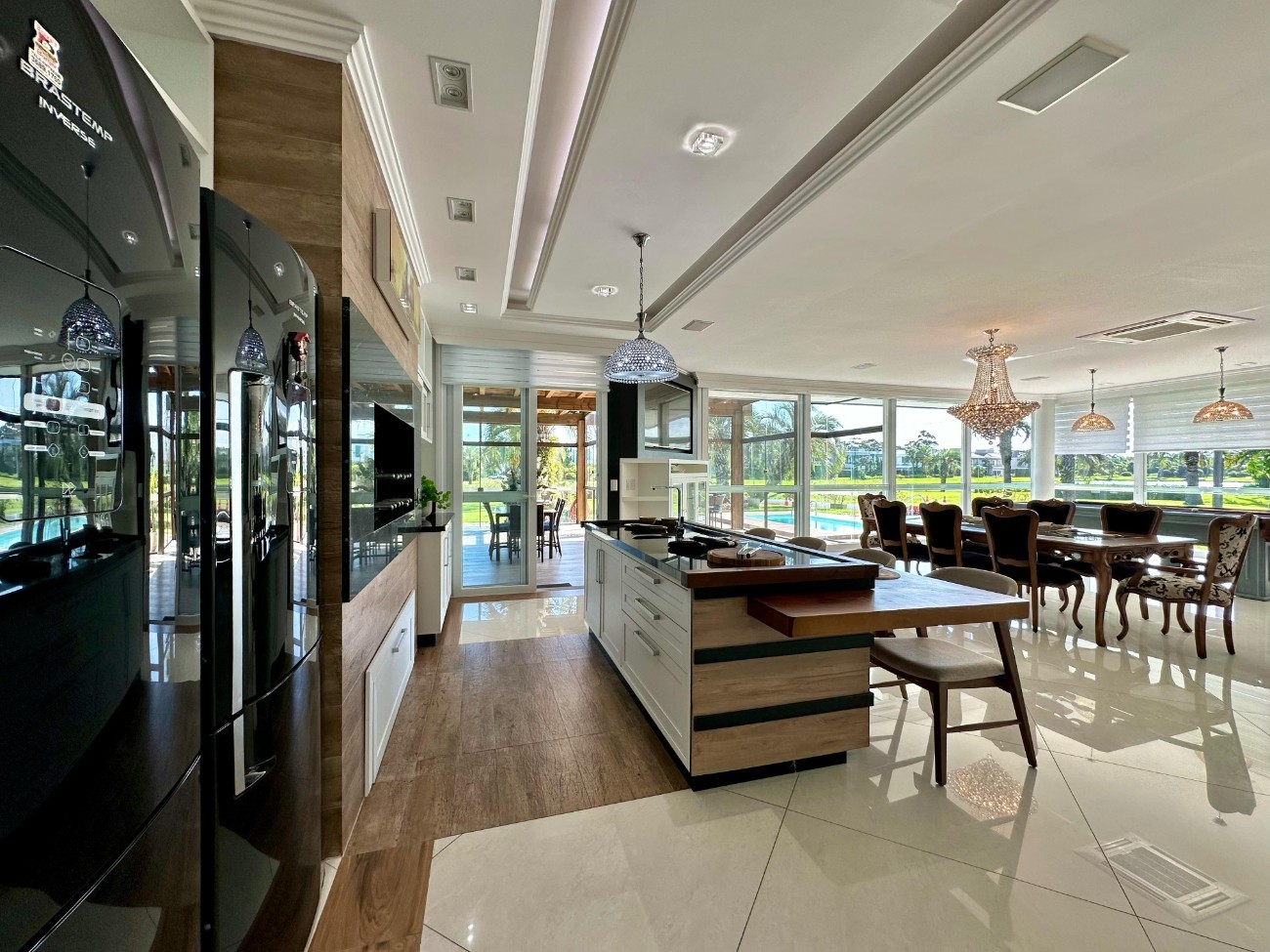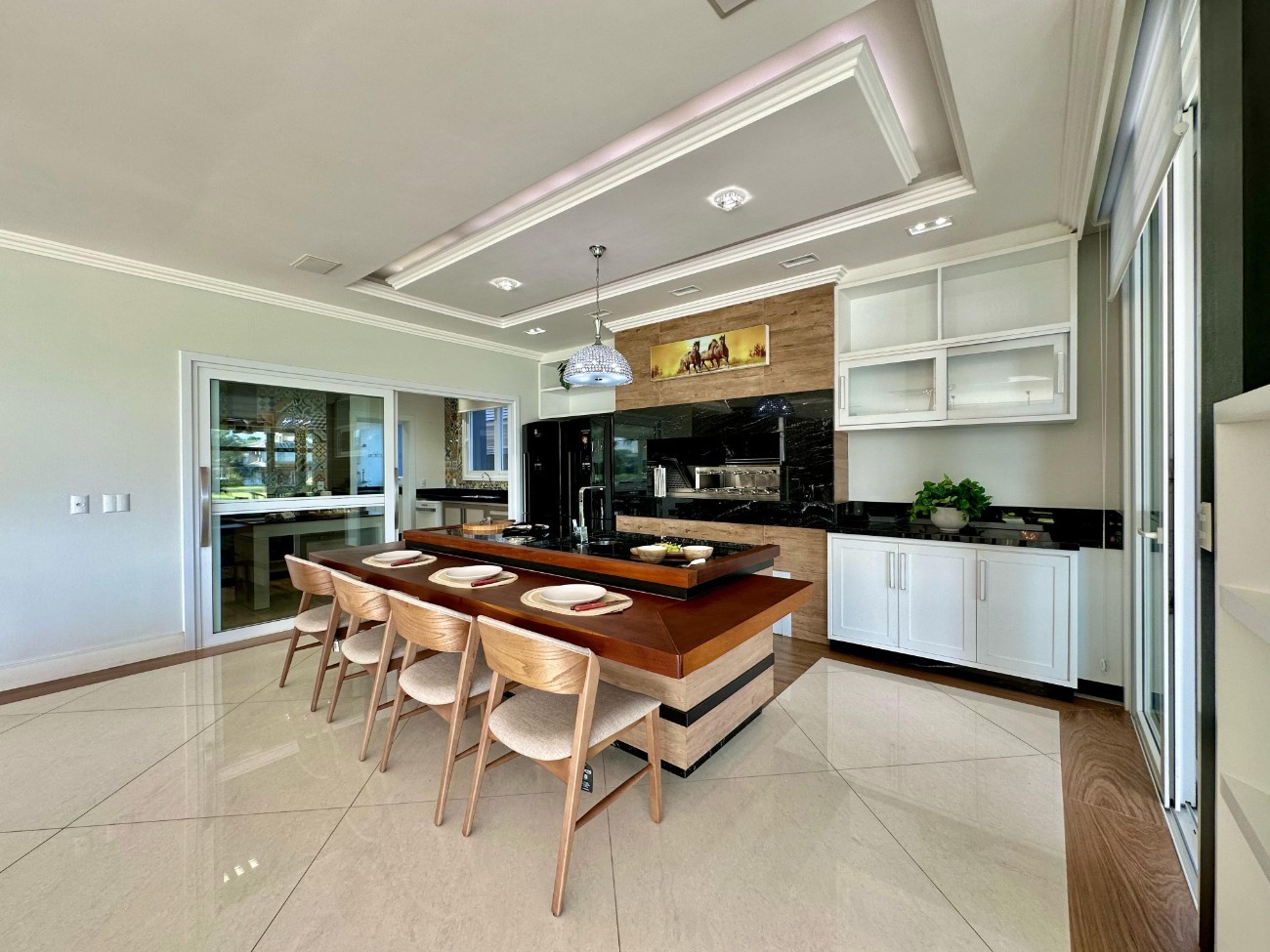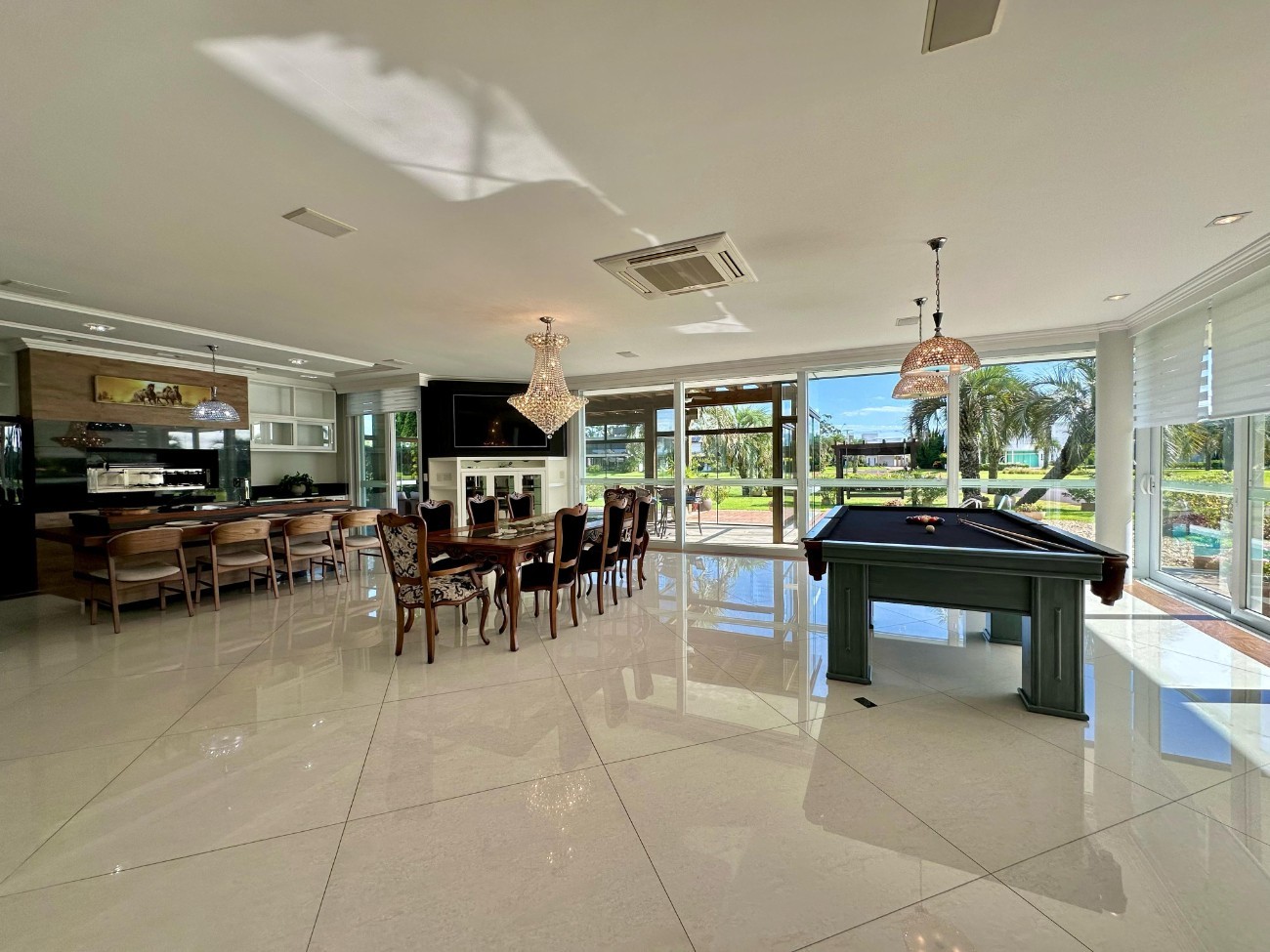 O living integrado com lareira cria uma atmosfera acolhedora, enquanto o espaço gourmet com bar, mesa de sinuca e um pergolado envidraçado de 100m² é perfeito para momentos inesquecíveis com amigos e família.