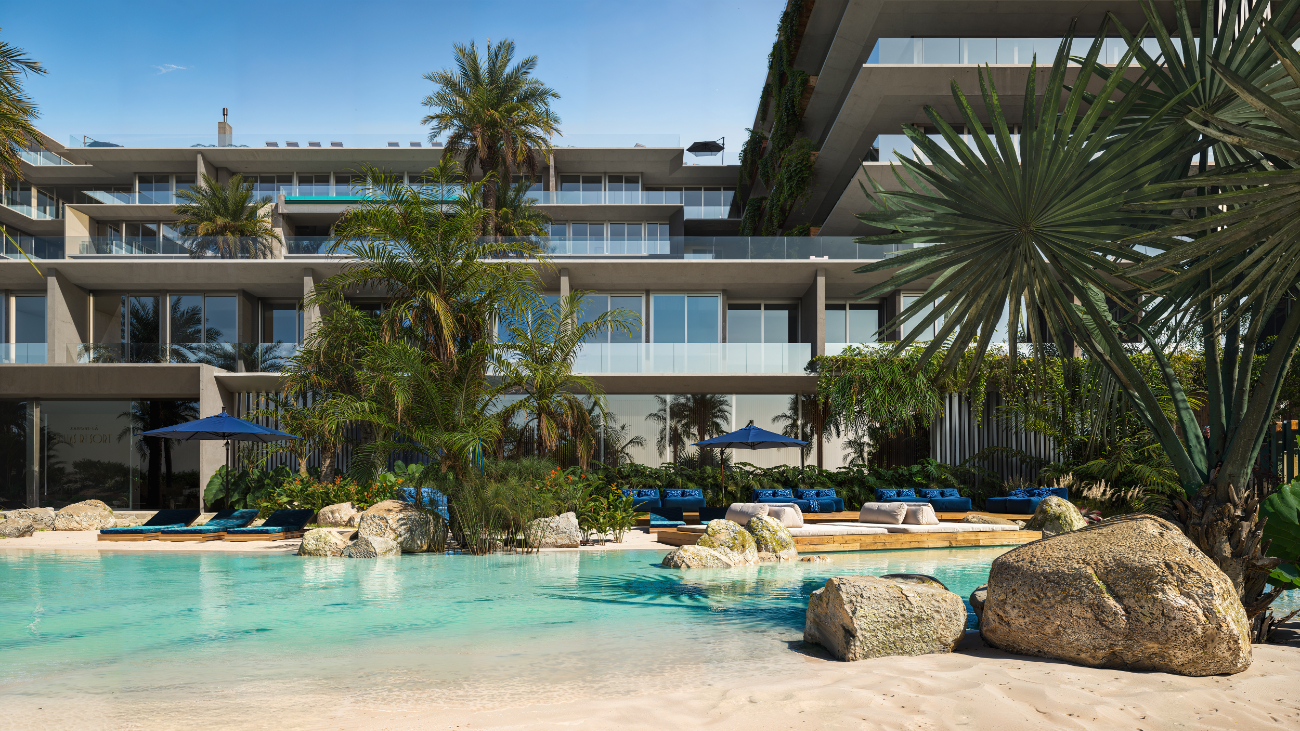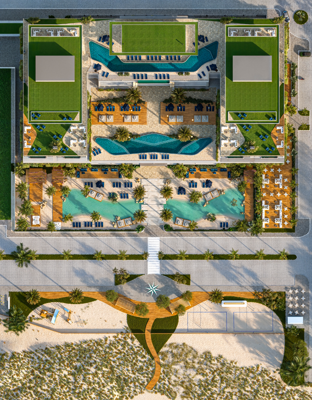 O condomínio conta com uma infraestrutura completa de lazer e bem-estar, incluindo praia artificial com mais de 2.500 m², piscinas, rooftop panorâmico, restaurantes, espaços gourmet, fitness center, lounges, sauna e áreas de convivência integradas à natureza.